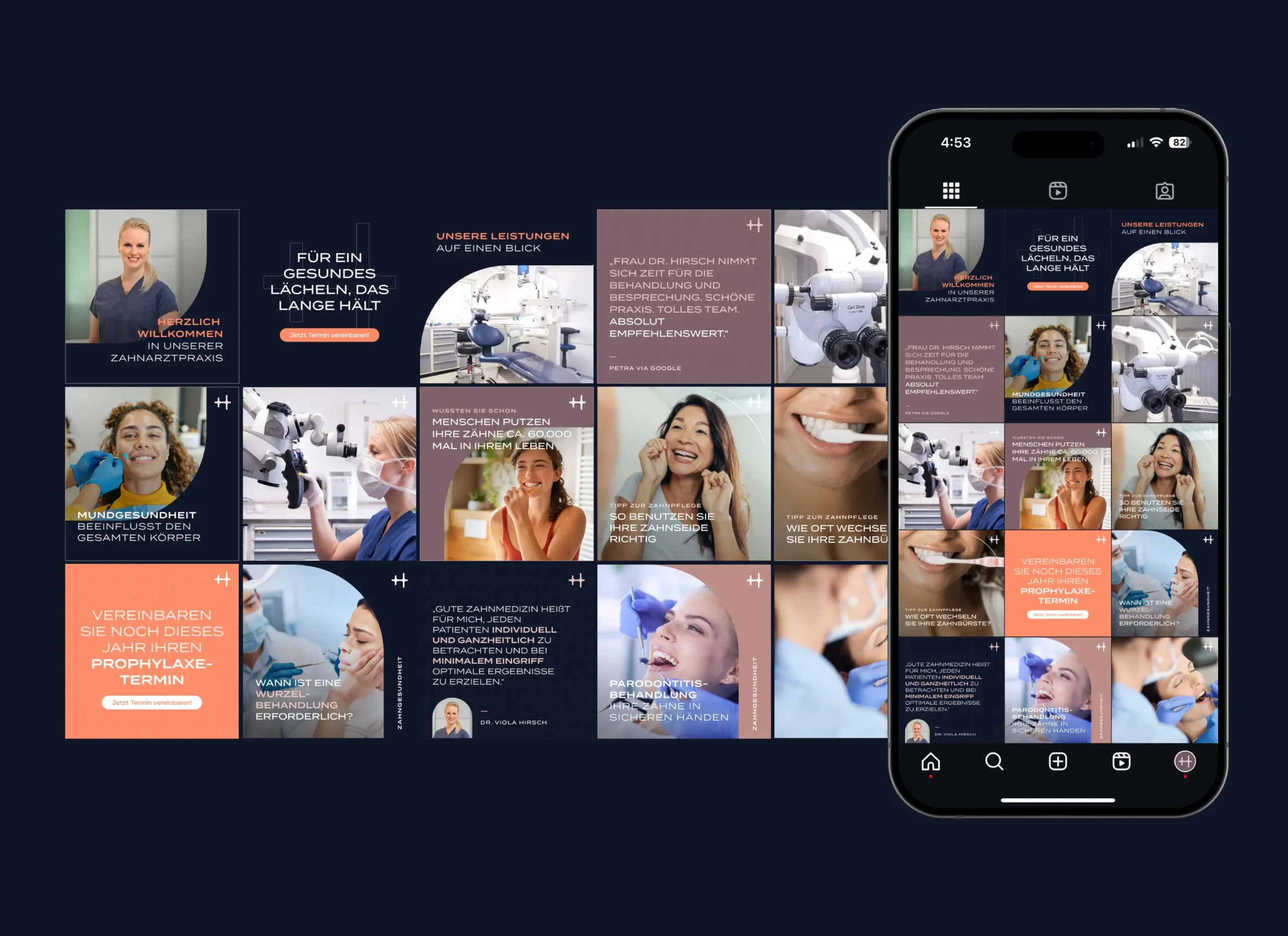 Von der Wort-Bild-Marke und Brand Design über Social Media Marketing bis hin zu einer hochwertigen Geschäftsausstattung und Beschilderung haben wir ein ganzheitliches Erscheinungsbild entwickelt. Das Credo „Für ein gesundes Lächeln, das lange hält“ verkörpert die Werte der Praxis und zieht sich durch alle Kommunikationsmaßnahmen – modern, authentisch und vertrauensvoll.