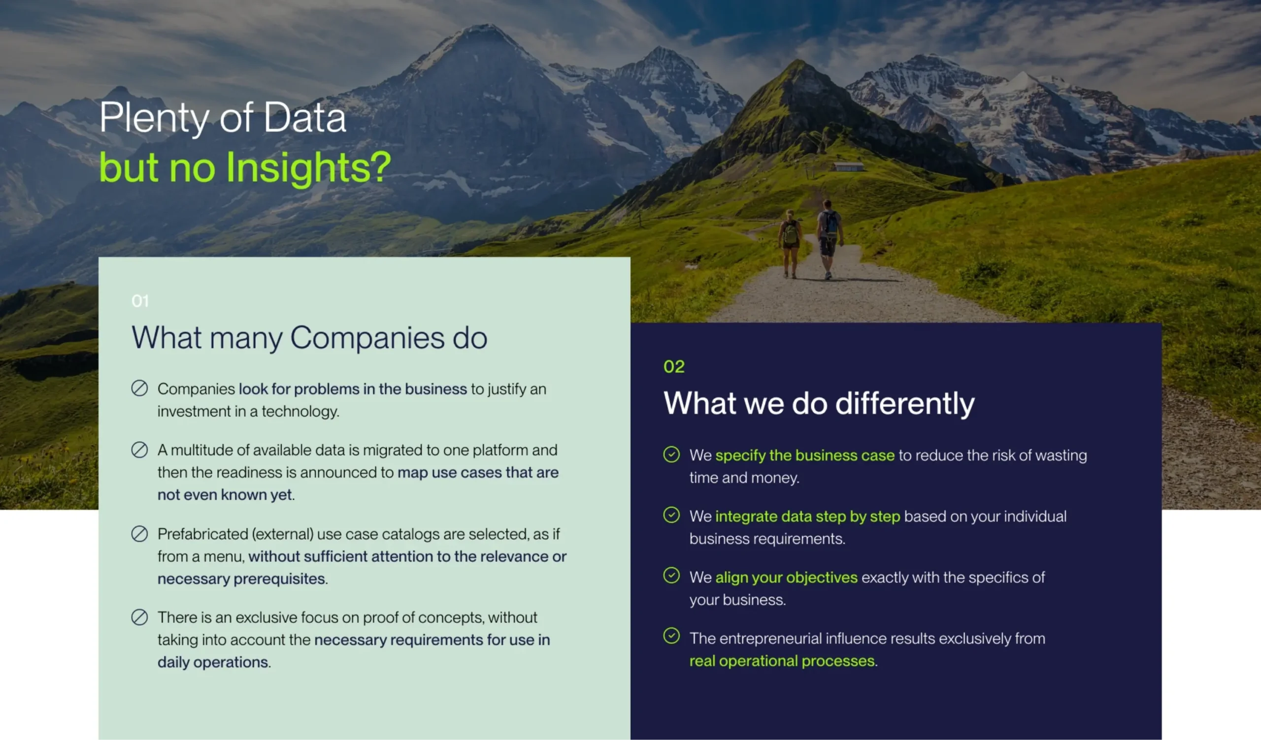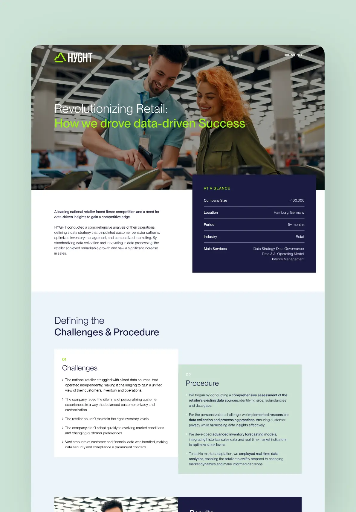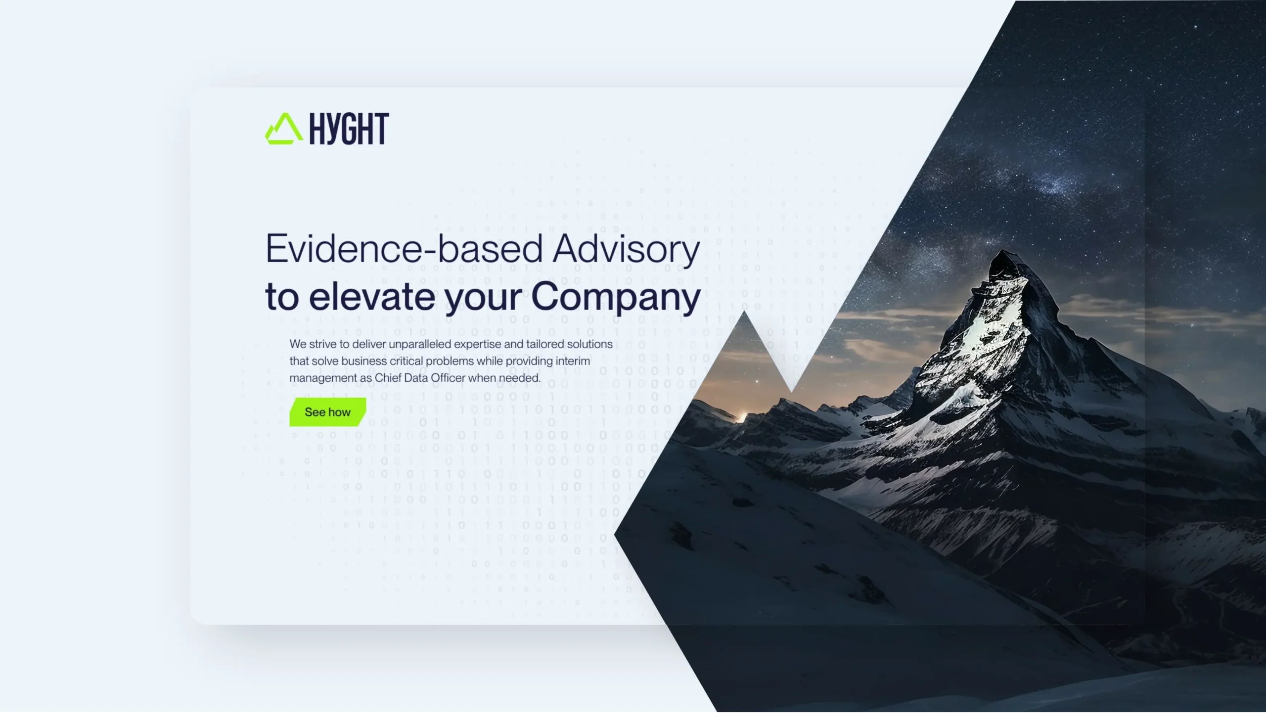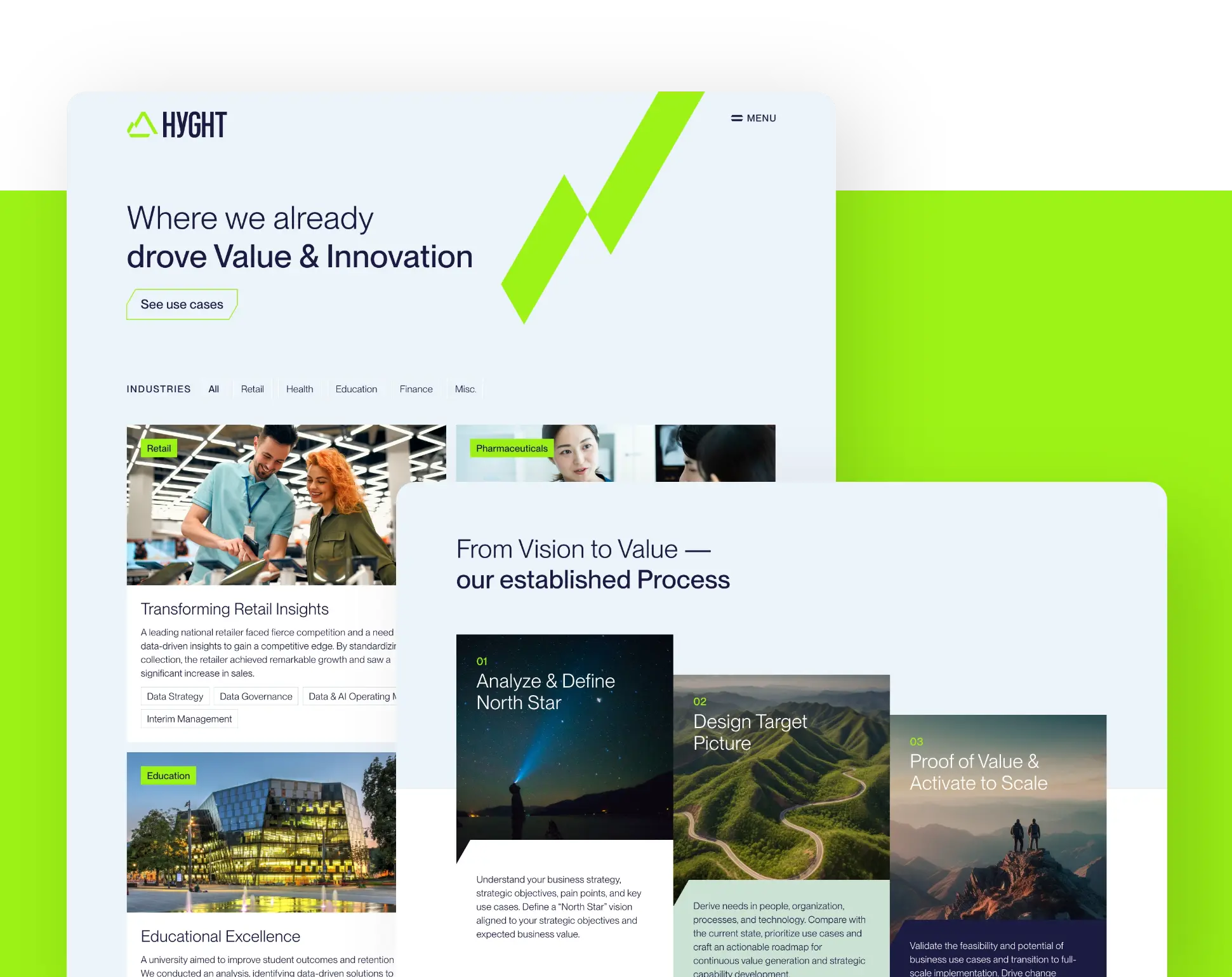 Wir haben das Unternehmen perfekt ausgerüstet und einen neuen Namen gefunden – angelehnt an die Schweizer Berge, in denen HYGHT zuhause ist – und eine aussagekräftige Wort-Bild-Marke sowie Markenidentität geschaffen. Die Webpage zeigt übersichtlich den Prozess „from Vision to Value“, die Leistungen sowie Kundenprojekte, bei denen HYGHT bereits Mehrwerte durch Daten schaffen konnten.