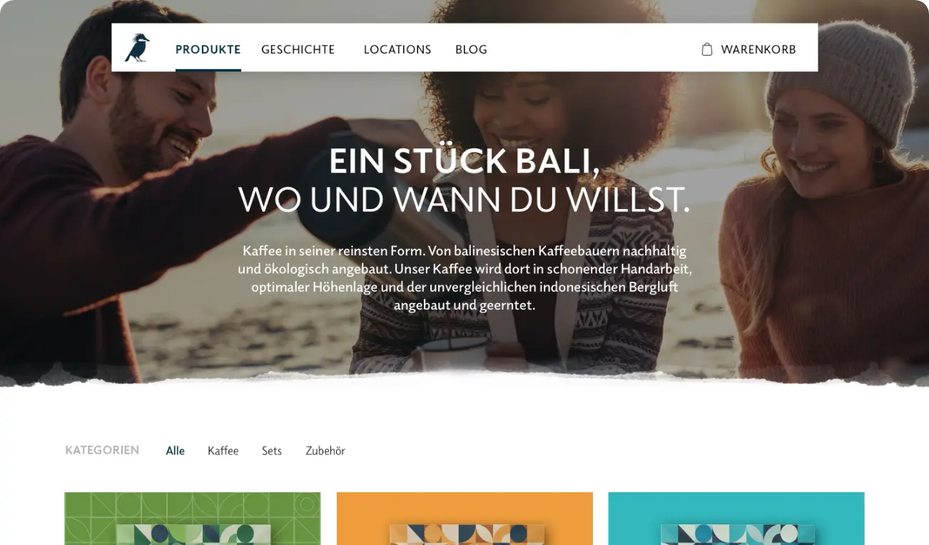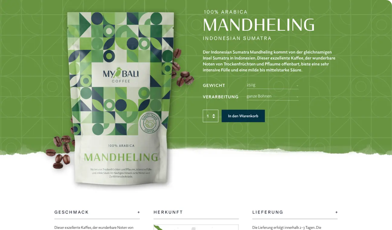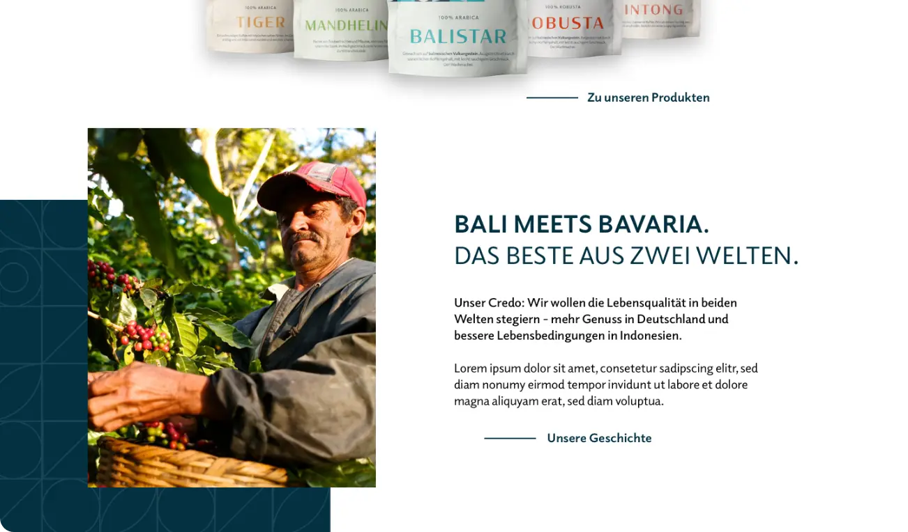 Die junge Kaffeemarke haben wir gänzlich neu verpackt – mit einer umfangreichen Corporate Identity, einem Webshop, der die Produkte in den Vordergrund stellt und neuen Packagings, bei der die individuellen Farbpaletten für die Eigenschaften der verschiedenen Kaffeesorten steht und die Elemente des Musters aus dem Logo abgeleitet sind.
