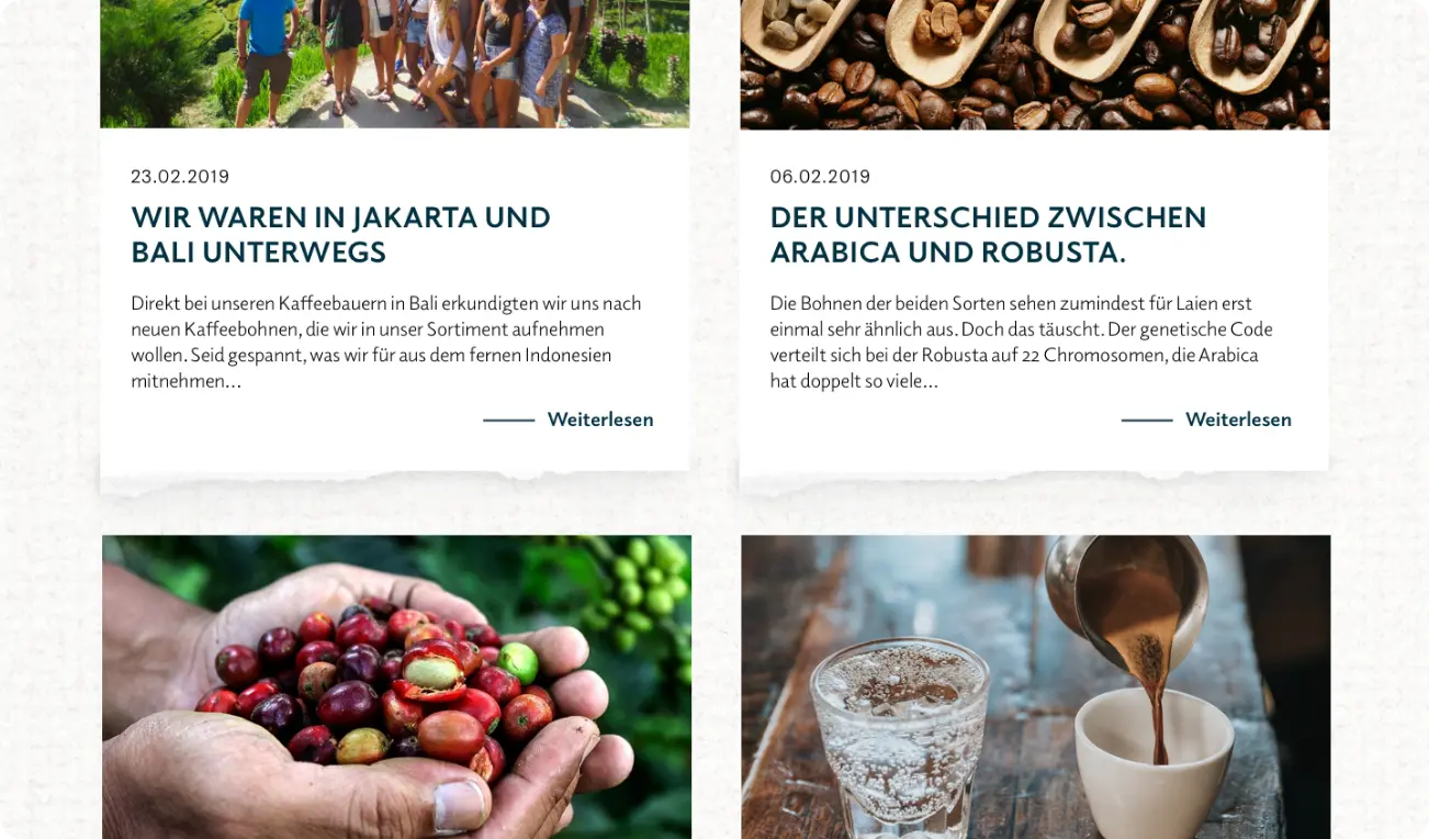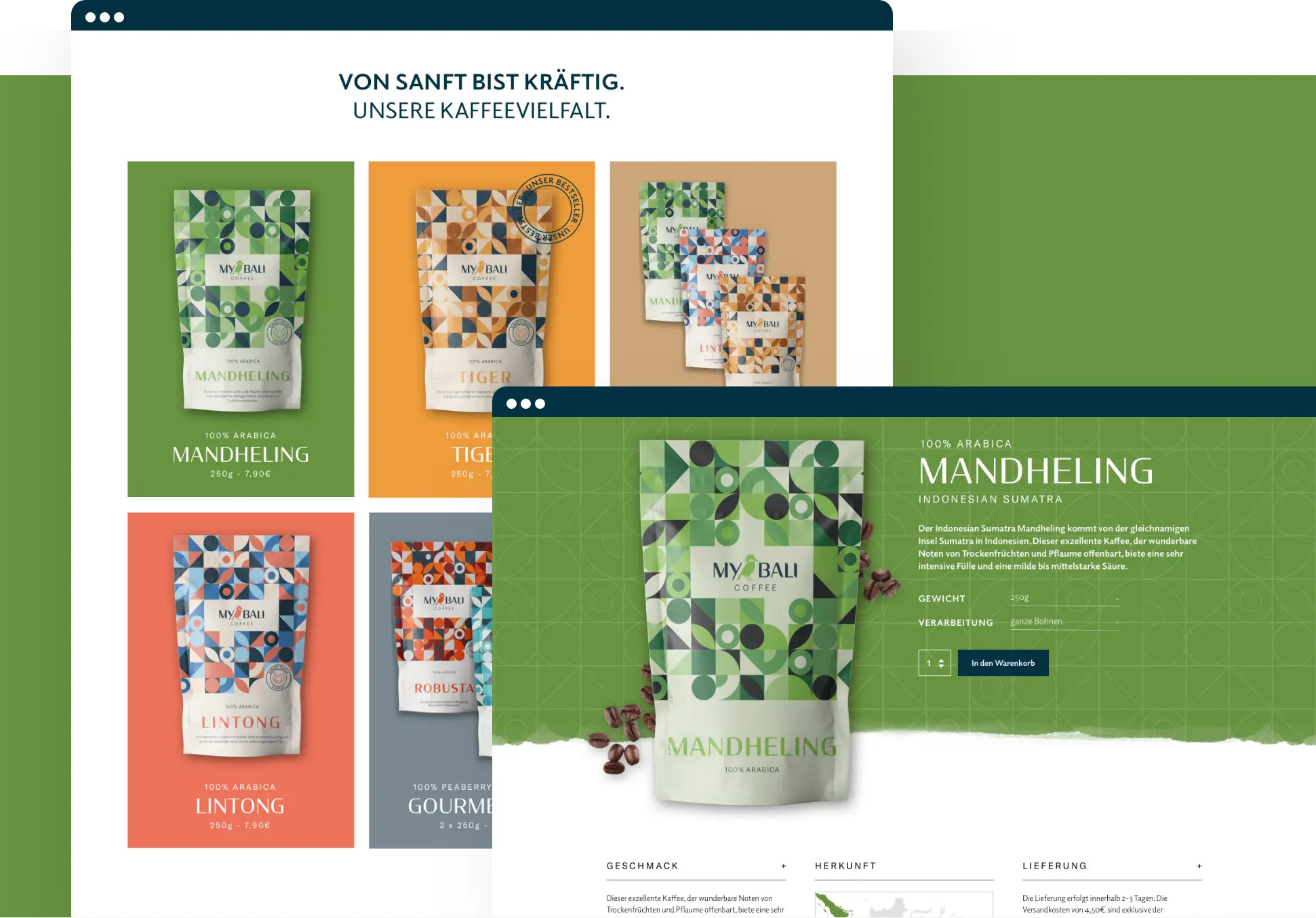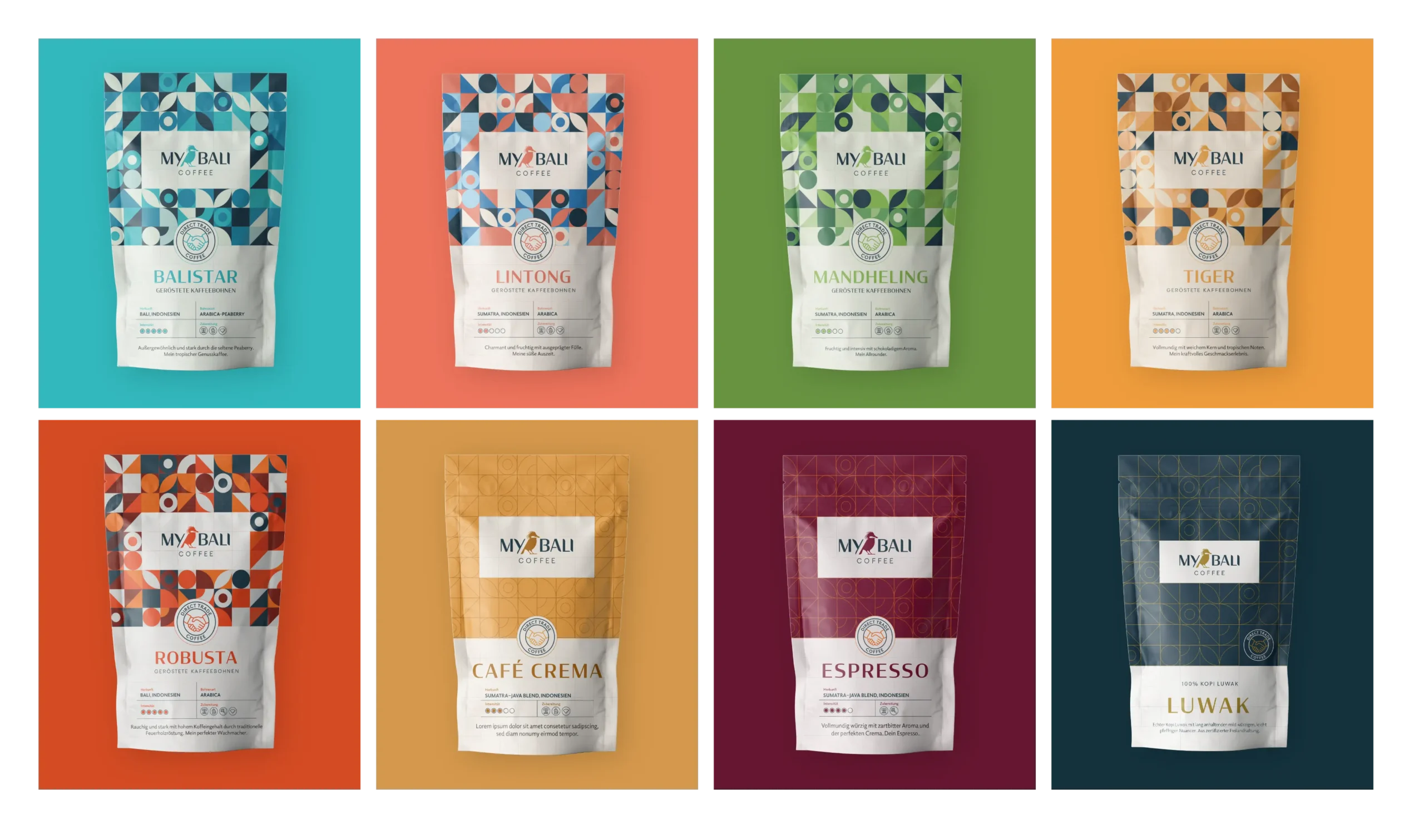 Die junge Kaffeemarke haben wir gänzlich neu verpackt – mit einer umfangreichen Corporate Identity, einem Webshop, der die Produkte in den Vordergrund stellt und neuen Packagings, bei der die individuellen Farbpaletten für die Eigenschaften der verschiedenen Kaffeesorten steht und die Elemente des Musters aus dem Logo abgeleitet sind.