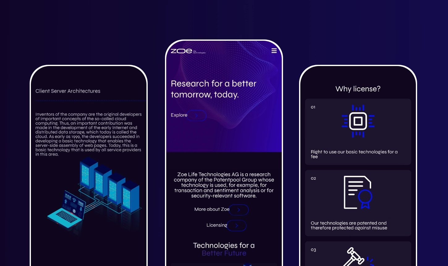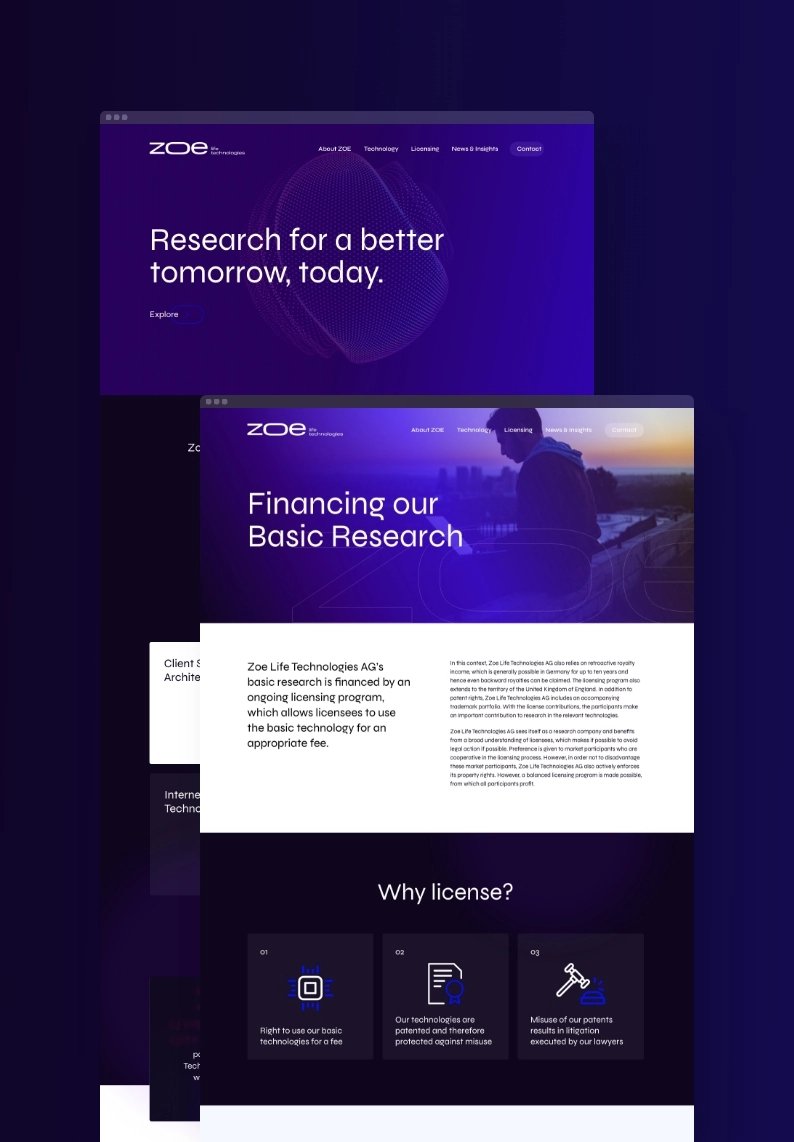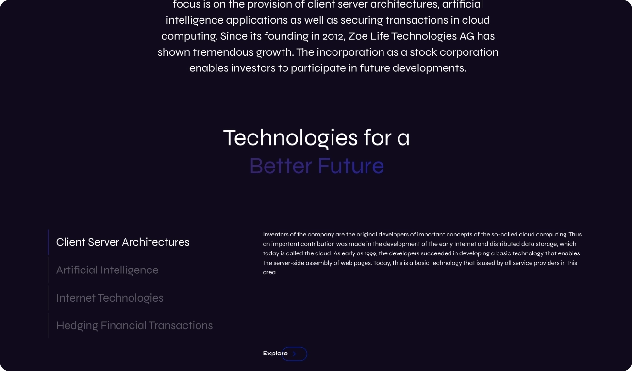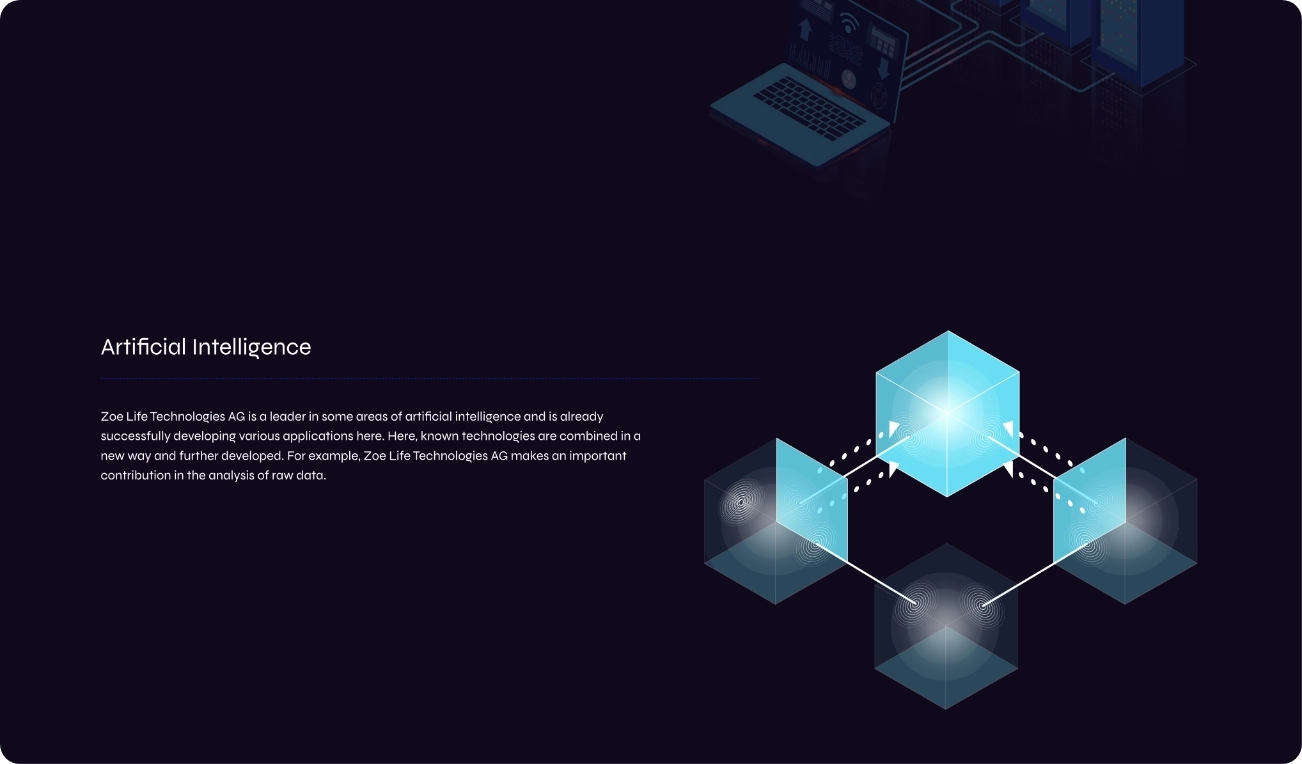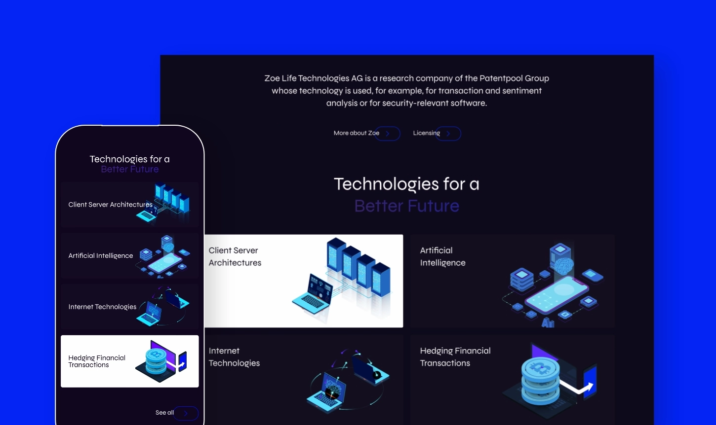 Die Zoe Life Technologies AG ist ein Forschungsunternehmen innerhalb der Patentpool-Gruppe, dessen Technologie in Bereichen wie Transaktions- und Sentimentanalysen sowie sicherheitsrelevanter Software Anwendung findet.